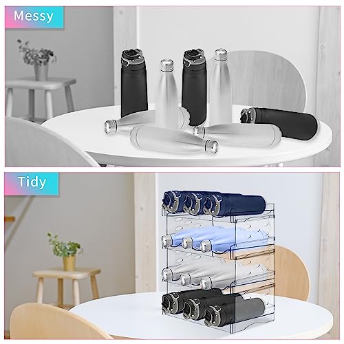 • 【Stackable Design】This set water bottle organizer of 4 shelves can hold 3 containers in each shelf, hold 12 Bottles total. The Shelves can be disassembled or stacked of each other for maximum space utlization, and keeping most types of bottles contained, containers placed into a shelf stays in place and does not roll around.
