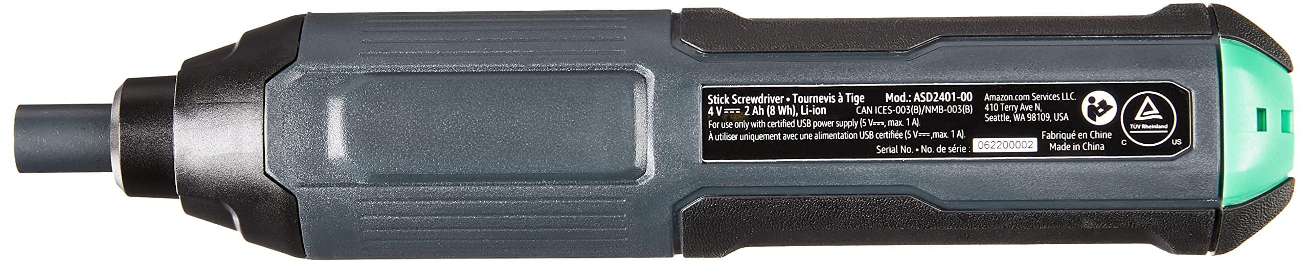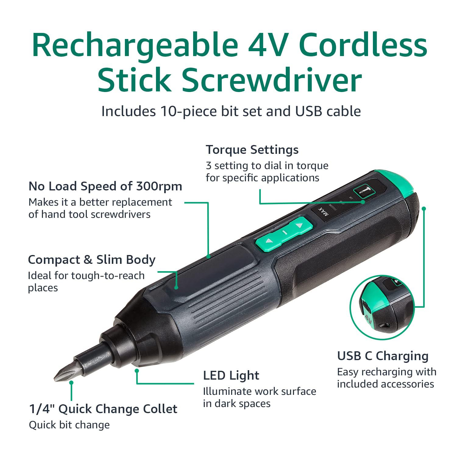 - Includes a 3.6 V (4 V Max) stick screwdriver, built-in rechargeable 2000 mAh lithium-ion battery, USB-C charging cable, and 10-piece bit set