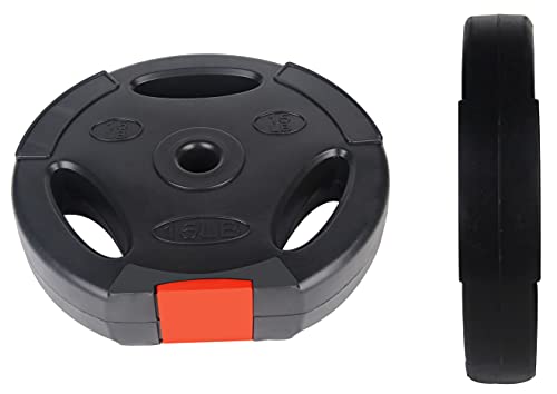 - Made of thick vinyl shell filled with cement with a 1-inch center hole fits any Standard bar with diameter 1” or less