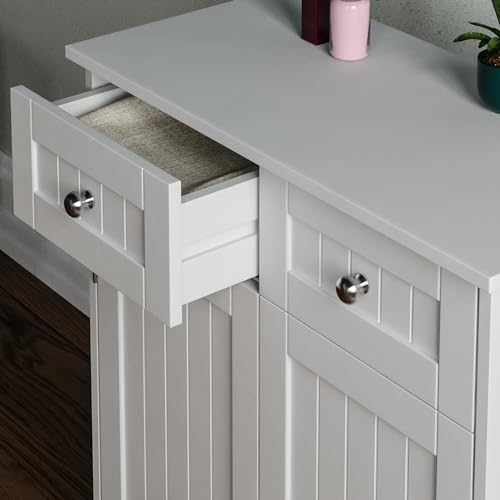 • Our Priano bathroom cabinet has a white painted smooth finish with grooved doors, drawers, and side panels, giving it a stylish and modern look.