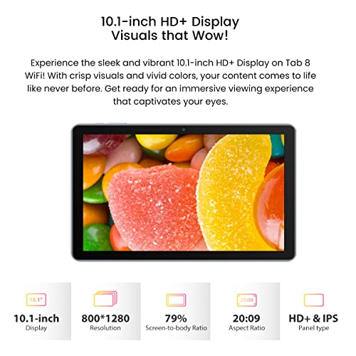 - ★【10.1-inch HD+ Display, Visuals that Wow!】Experience the sleek and vibrant 10.1-inch HD+ Display on Tab 8 WiFi! With crisp visuals and vivid colors, your content comes to life like never before. Get ready for an immersive viewing experience that captivates your eyes.(800*1280 resolution, 20:09 aspect ratio, HD+ & IPS)