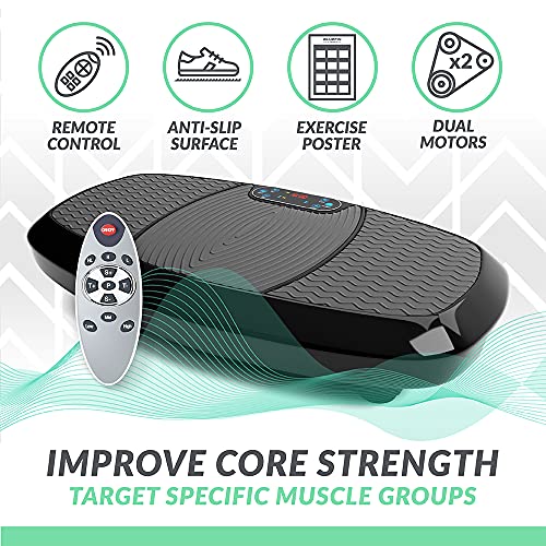 - Box contents: vibration plate, training bands, remote control, training poster and user manual