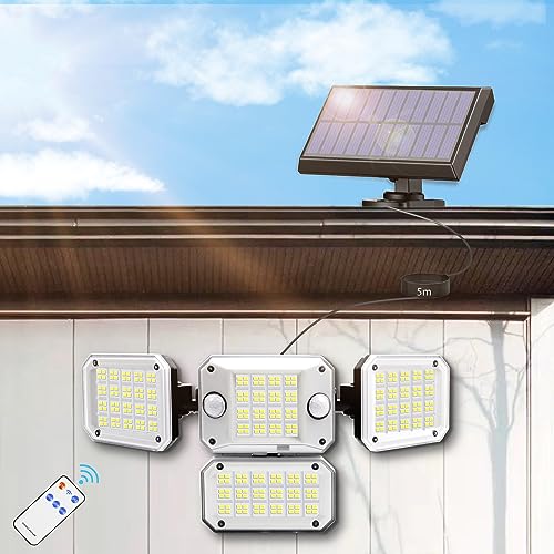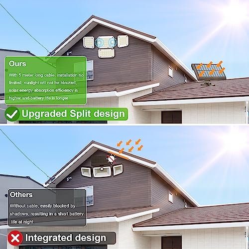 - Split Design Solar Garden Lights: The solar panel and lamp body can be connected by 5 meter long cable, no limited of installation indoor or outdoor, this motion sensor solar floodlight avoids the problem that the solar panel is blocked by shadows and can't absorb better sun energy, which greatly improve its battery life and lighting time longer.