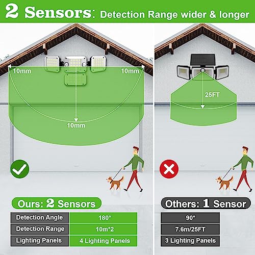 - Upgraded 2 Sensors Solar Lights Outdoor: Compared with most single-sensor solar lights, DSLebeen motion sensor security lights are with 2 sensitive PIR sensors, its detection range can up to 10 meters and 180° detection angle, which reduce some detection blind areas, improve its lighting area and safety of home protection.