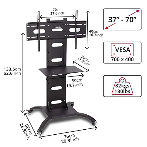 - SPECIFICATIONS: The TVS4T1 is a strong heavy-duty television stand with a bracket to hold one TV that is between 37”-70”. VESA capability is up to 700x400mm. Height of stand: 133.5cm. Max weight capacity: 82kg. Made from cold-rolled steel and aluminium. Features caster wheels with brakes. This stand comes with all the fixings needed for up to 99% of TV’s. Additional tools needed: a Phillips screwdriver and a second pair of hands to help get the TV up onto the stand.