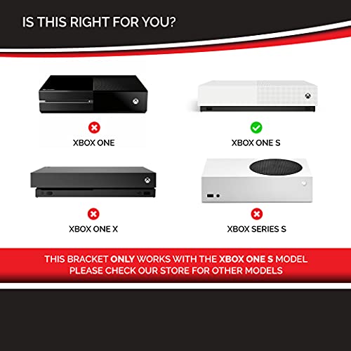 Product Description Features Mounts your Xbox One S To wall or back of TV Designed to be mounted in multiple direction Fixings Included (Wood screws & Raw plugs & M4 Screws) VESA compatible for 100mm and 200mm Made From Durable Steel Made in the UK Xbox One S Wall Mount Sleek & Minimalist Design The sleek design of the Xbox One S Mounting Bracket ensures the bracket is barely visible to ensure it doesn't take away from the overall design of the Xbox One S, it can be mounted in multiple directions which makes it perfect to avoid awkward cable placement and makes for ideal mounting to suit your unique needs. Clutter Free Get the clean setup you want, and clear space from shelves or the desk, and prevent damages from scratches and spills. Ports Accessible Our Xbox One S bracket has been designed with port access in mind and all ports are easy accessible, both on the front and the back of the Xbox. The Xbox bracket is also designed in a way that it can be mounted in direction to accommodate easy cable management. Vents Unobstructed We have ensured our Xbox Bracket does not obstruct the air vents, and keeps good air flow for the Xbox to ensure it does not cause overheating. Both Side vents and also the main top vent are unobstructed so this will prevent any issues. Steel & Powder coated Our Xbox One bracket is made from robust steel. We provide this in both white or black for added durability, and also helps match the Xbox One S itself so it gives the appearance of the Xbox floating. In The Box *Xbox One S is not included and only used for illustration purposes Xbox One S Mounting Bracket 2x Flat countersunk Screws 2x Raw Plugs 2x M4 Countersunk Screws Installation Options Wall Mounting: Hold bracket in required position, ensuring it is level and mark holes required for drilling. Drill and insert raw plugs, then secure bracket with screws provided Back Of TV Mounting (VESA): To mount the bracket to the back of the TV you may need to purchase either M6 or M8 screws depending on your TV as we only include M4 For more details please see TV instruction manual Product Dimensions: Length: 300mm Width: 230mm Height: 70mm Xbox One S Sky Q Mini PS4 Slim Virgin Media V6 PS4 Pro Name Xbox One 1 Digital Wall Mount Sky Q Mini Wall Mount PS4 Slim Wall Mount Vrigin Media V6 box Wall Mount PS4 Pro Wall Mount Colour Options White Black Black or White Black Black or White Fixtures & Fittings Included? ✓ ✓ ✓ ✓ ✓ VESA Compatible? ✓ ✓ Made & Produced in the UK ✓ ✓ ✓ ✓ ✓ Dimensions 300 x 230 x 69mm 238 x 125 x 36mm 234 x 146 x 61mm