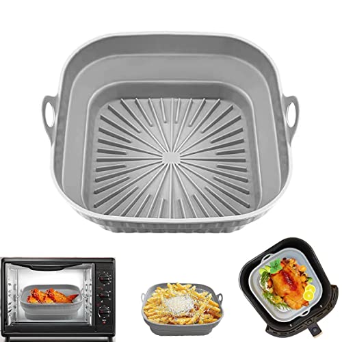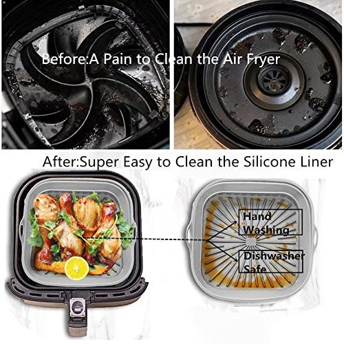 • 【Multi-functional Air Fyer Silicone Pot】:21x21x6cm/8x8x2.4inch(LxWxH), square size,usually handles food more efficiently and fits better than the round ones, it can be used for a wide range of brands and models of air fryers at 5QT or bigger,and it can be used not only for frying but also for steaming, baking, boiling and stewing, allowing you to create more dishes.