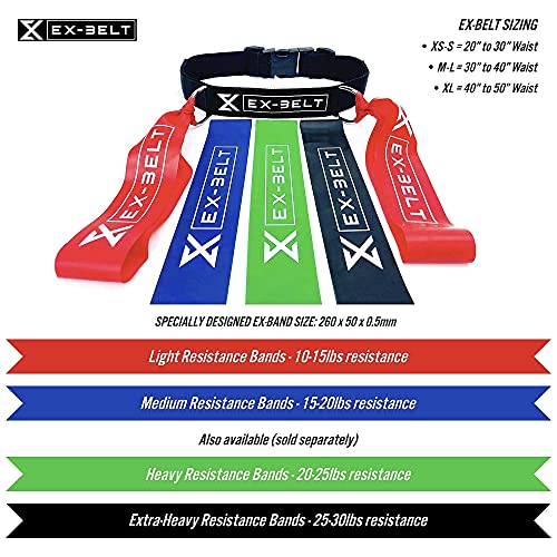 • 👌 4 CUSTOMIZE RESISTANCE LEVELS – A set of LIGHT/RED, MEDIUM/BLUE resistance bands are included with EX-BELT. Additional EX-BANDS sold separately. Add the HEAVY/GREEN and EXTRA HEAVY/BLACK resistance bands to increase your intensity. Only our specially sized EX-BANDS fit the EX-BELT.