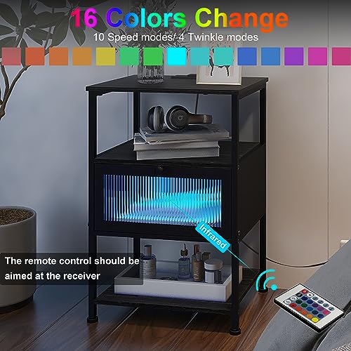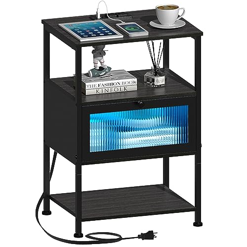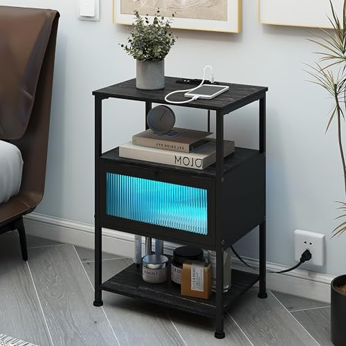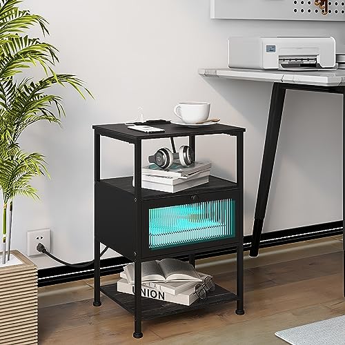 EXOTICA Black Nightstand with Charging Station and LED Lights 3 Tier End Table with USB Ports and Outlets Bedside Table with Acrylic Door and Sto