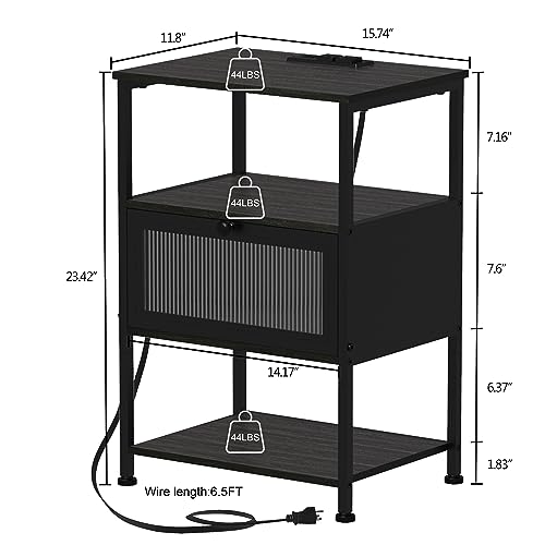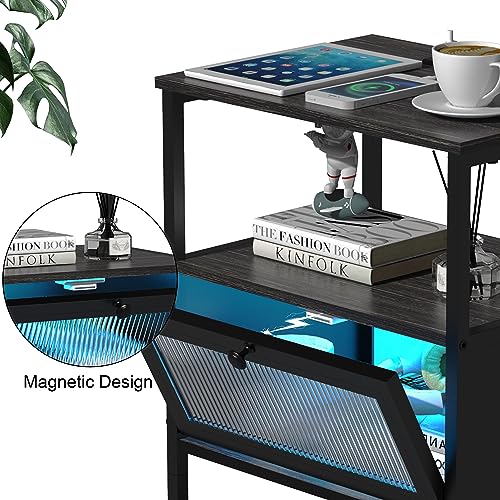 Home Bedroom Furniture EXOTICA Black Nightstand with Charging Station and LED Lights 3 Tier End Table with USB Ports and Outlets Bedside Table with Acrylic Door and Sto