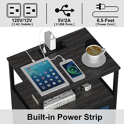 • Bedside Table with Charging Station The Bedside Table comes with 2 USB ports and 2 3-prong power outlets, allowing you to conveniently charge your phone, laptop, desk lamp, and smart speaker, it serves multiple functions, functioning as a coffee table, sofa table, end table, side table, living room table, and charging station. The power cord is 6.56 feet, providing flexibility in placement.
