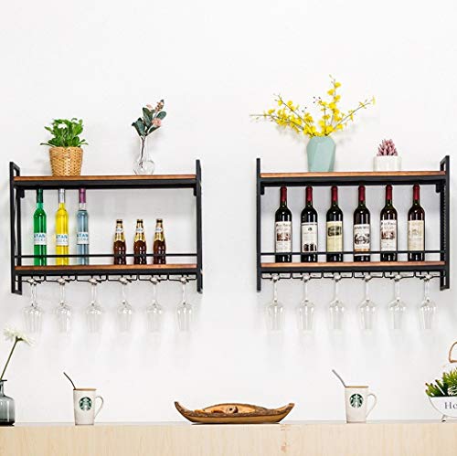 EYLINK Vintage Rustic Floating Shelves Wine Rack, Bar Kitchen Metal and Wood Wine Bottle Rack Wine Stemware Rack Goblet Holder 2 Tiers Wall Shelf