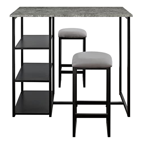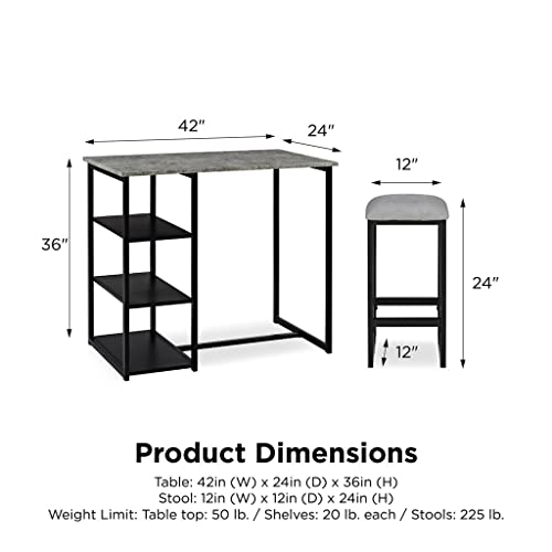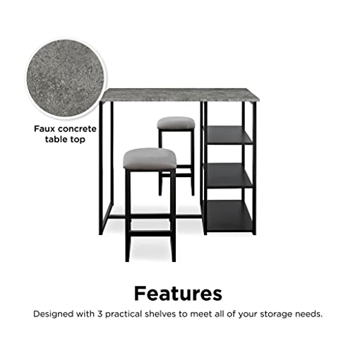 - The set includes a rectangular faux concrete table top, black metal finish base and two square stools.