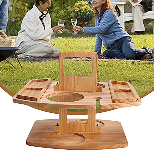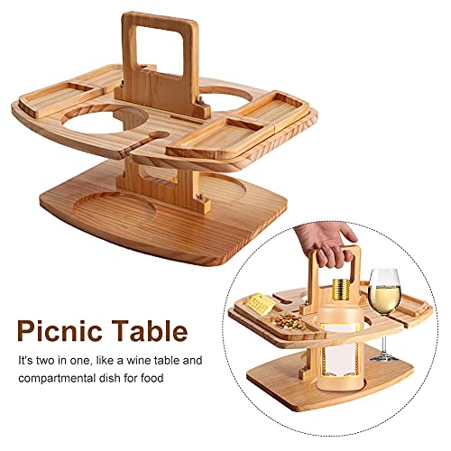 - 【Clever Design】This folding wine table is designed to hold all the elements of a classic picnic: 2 wine glasses, 2 wine bottles, and 4 plates filled with your favorite treats. Enjoy your leisure time with your family and friends more conveniently.