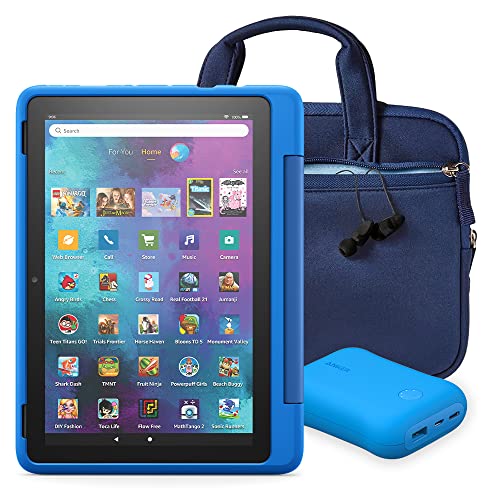 Home Computers & Accessories Fire HD 10 Kids Pro tablet, Sky Blue Kid-Friendly Case + NuPro Zipper Sleeve, Blue + Kids Portable Charger, Blue