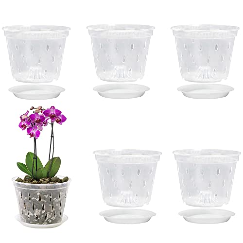 - [Dimensions & Package Contents]: You will get 5 clear plastic plant pots, 5.5 inches in diameter and 4.1 inches in height. The package also comes with 5 pack clear plates. If you have any questions about our orchid cultivation pots, please contact us in time and we will provide you with a solution.