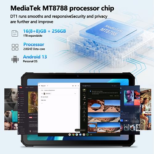 - 【16GB RAM +256GB ROM & Octa-Core CPU & Android 13】FOSSiBOT DT1 rugged tablet With 256GB ROM and 1TB expansion, ample storage space allows you to store massive files and pictures at will. MT8788 Octa-Core CPU is designed for high-tablets, offering superior data processing and image processing capabilities with lower power consumption. with 16GB RAM (8GB fixed RAM + 8GB adjustable RAM)