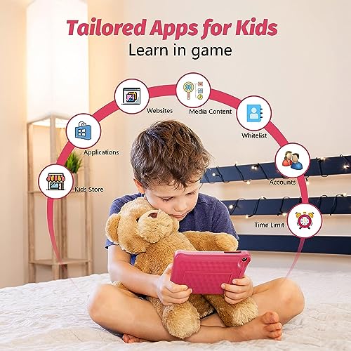 - 【New Android 12 Kids Tablet】Freeski tablet for kids is equipped with the latest Android 12 operating system, equipped with a quad-core processor, 32GB ROM, expandable to 128GB, providing faster application process response and storing more memories.