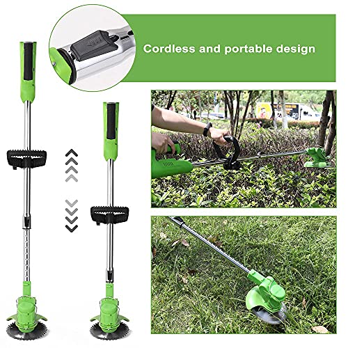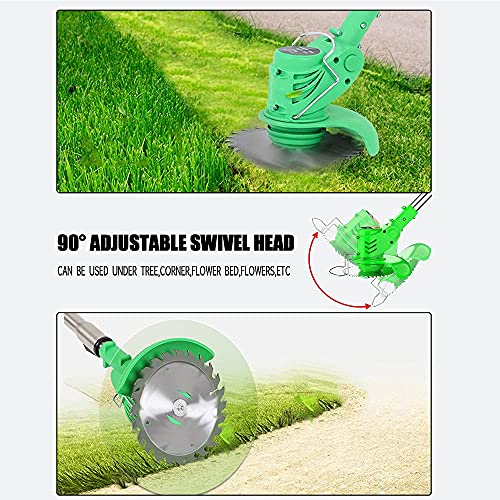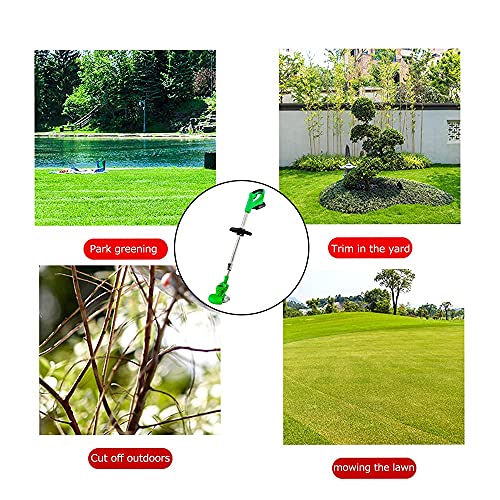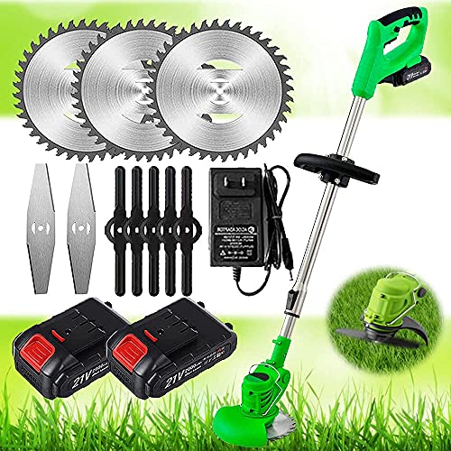 - [3 in 1 Battery Operated Weed Eater] Cordless electric weed eater with 3 kinds of blades, Manganese steel circular saw blades are suitable branches Pruning thicker shrubs, weeds and small shrubs, the metal blades in stainless steel are suitable for mowing lawns, plastic blades are suitable for mowing soft grass, easy to clean and not rusted. High strength coated and hardened blades that prune leaves effortlessly.