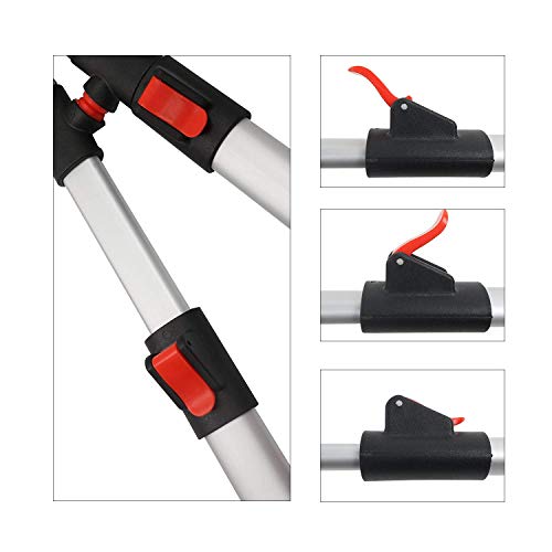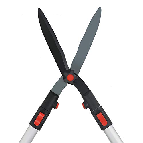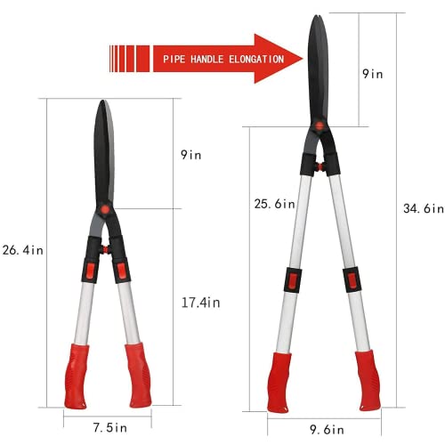 • COMFORTABLE ADJUSTABLE HANDLES: Our hedge trimmer is a must have gardening tool ideal for trimming and shaping hedges, decorative shrubs. Reach any shrub far and high! The overall length in closed position is 26’’ and the overall length in extended mode is 34.6’’ made of high quality aluminum alloy and TPR non-slip rubber. Ergonomic designed soft-grip touch points enhance comfort and control.
