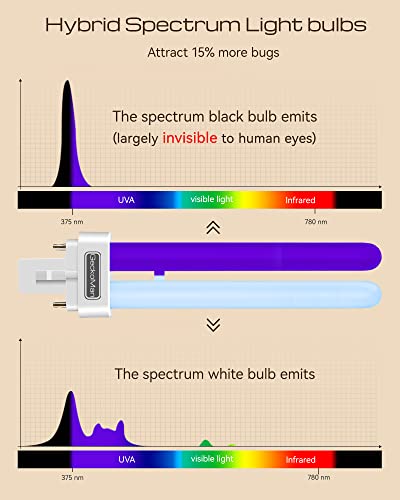 - 【🌈 Hybrid Spectrum】15W hybrid regular UV and black UV dual bulbs emit a broader light spectrum, which is more effective in attracting a variety of pests, including flies, fruit flies, mosquitoes, gnats, and moths, etc.
