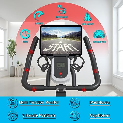 • 🚴【LCD MONITOR & IPAD MOUNT】The exercise bike is equipped with a multi-function LCD monitor that displays time, speed, distance, calories burned, mile(NOT km), allowing you to easily get all the training data. And equipped with a multi-function bracket that is equipped with water bottle holders, mobile phone bracket and IPAD bracket. You can watch videos or programs during training, enjoy sports and music, which can make the exercise more easily.