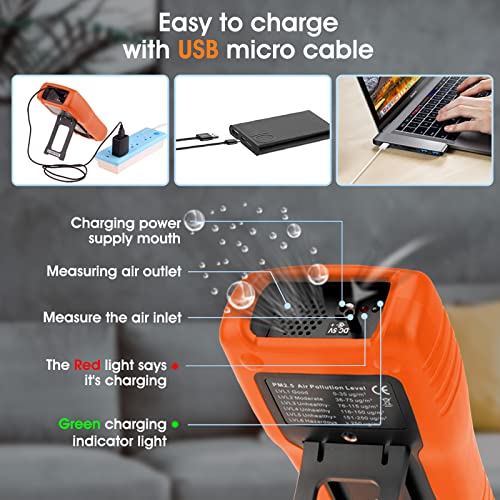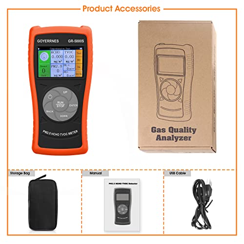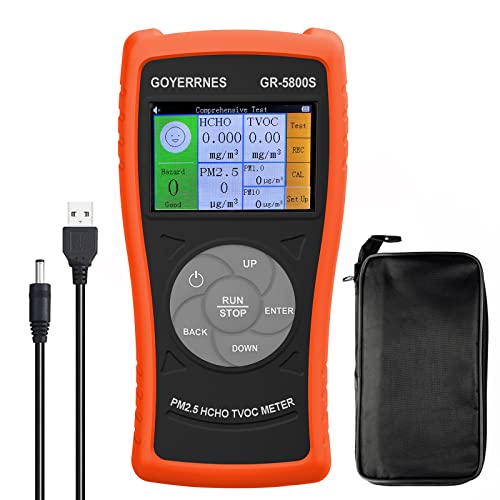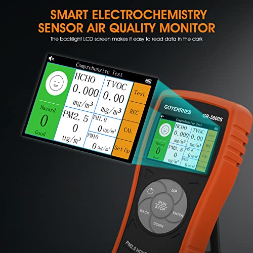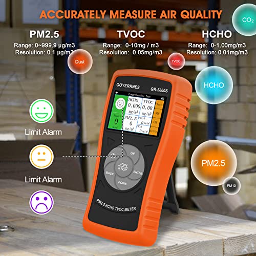 - Precise Air Quality Monitor The multi-function AQI detector adopts the principle of laser scattering to detect PM2.5/PM10 particles of 0~999.9 μg/m3 (minimum particle size: 0.3μm). Formaldehyde HCHO is measured by an electrochemical sensor (resolution: 0.01mg/m3). Test the TVOC of 0-10mg/m3 by thick film semiconductor gas sensor (resolution: 0.05mg/m3).