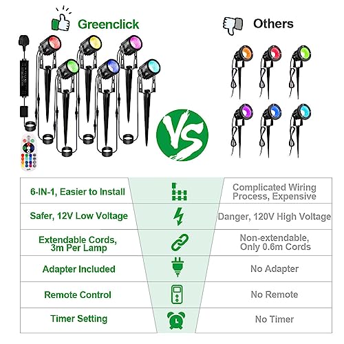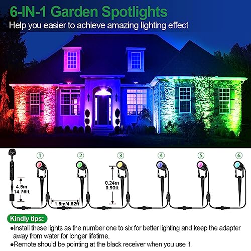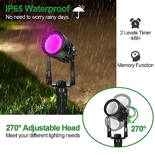 - 🌲【Unique Memory & Built-in Timer Spot Lighting】The outdoor landscape lights are designed with multiple lighting modes(Fade, Smooth, Flash), you can freely use the remote to choose what you like. The memory Function of the remote ensures the mode of spike lights keeps the same as you choose last time, even you cut down the power. Particularly, the garden spotlights outdoor also built-in Timer(4H/6H/8H), will be turned on for 4/6/8 hours and 20/18/16 hours off automatically cycle.