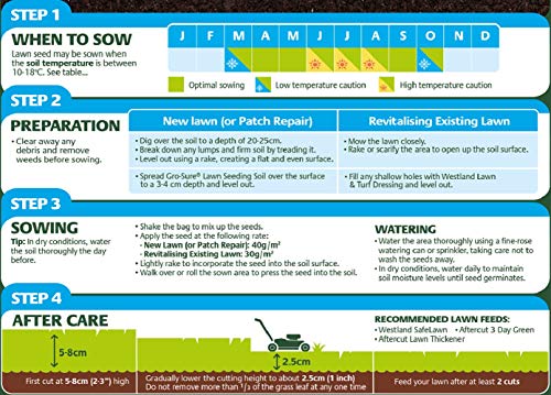 From the manufacturer Gro-Sure Smart Lawn Seed is coated with Aqua Gel to maximise growing success. Gro-Sure Smart Lawn Seed is effective in full sun, shade, patches and worn areas. It works by absorbing up to 400x its weight in water, slowly releasing moisture to the seed to increase germination success. Coated with Aqua Gel technology For a strong, healthy lawn in hot and dry conditions For a lush, green lawn in shady conditions Quickly repairs patches on your lawn For a resistant lawn in hard-wearing areas Gro-Sure Smart Lawn Seed may be sown when the soil temperature is between 10-18°C Soaks up to 400 times it’s weight in waterSlowly releases moisture to the seedProtects seed from under/over wateringIncreases germination success Keeps working for the whole seasonThe lawn seed that's guaranteed to grow**When pack instructions followed. We recommend using Westland SafeLawn, Aftercut Ultra Green Plus or Aftercut Lawn Thickener as lawn feeds at least 2 cuts after sowing your Gro-Sure Smart Lawn Seed.