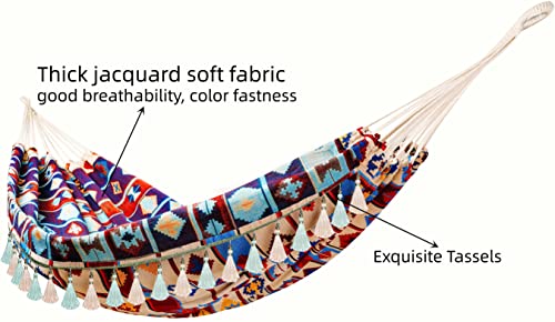 - Jacquard Retro Geometric Pattern Nordic Style Canvas Hammock with fringes to hang on the beach or on the patio outdoor garden Brazilian hammock adapts to two adults, Classic Brazilian Cotton Outdoor Garden Hammock Portable Camping Canvas Bed : Double size hammock for 1-2 people with 5ft (58 in.) Seat width - 200kg weight capacity. *** Minimum distance required to hang: 10-12ft. Bed width: 5 ft (150 cm); Fabric length: 200 cm; Total length: 280cm (9ft 2in). Packing Weight: 1.65kg/3.7lbs
