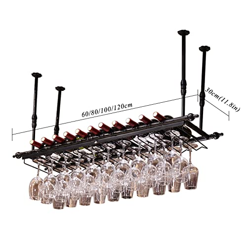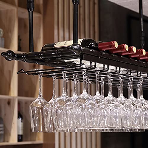 Hanging Wine Rack - Height Adjustable Hanging Wine Glass Rack, Ceiling Wine Bottle Holder with Glass Holder, Industrial Ceiling Shelf for Bar, Ca