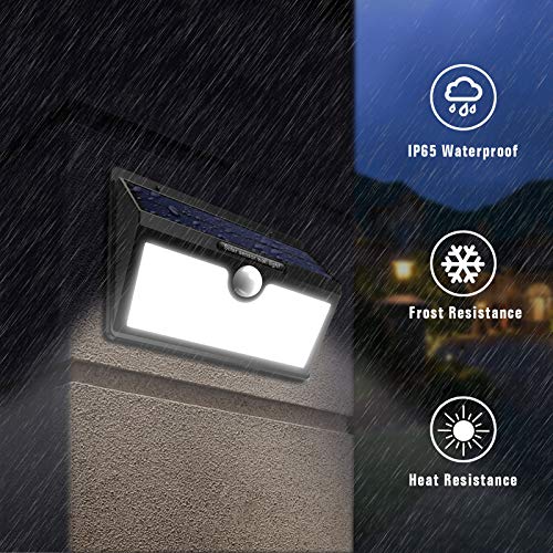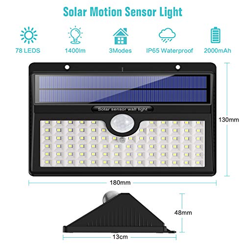 • 【Solar Lights with 3 Intelligent Motion Sensor Modes 】The updated PIR motion sensor angle of movement is 120º, detects people as far away as 20-26 feet, 78 LED Solar Lights have 3 Modes for your choice: ① strong long light mode, ② dim light sensor mode, ③ strong light sensor mode. Meet your different demands.