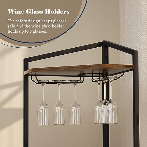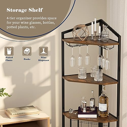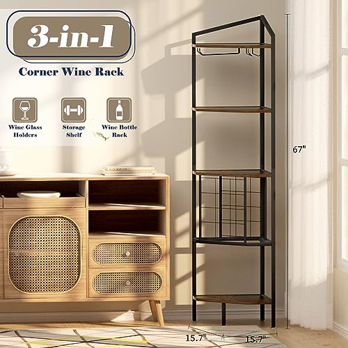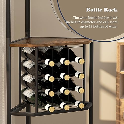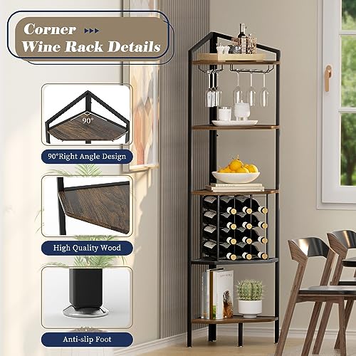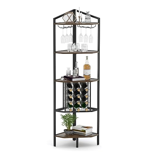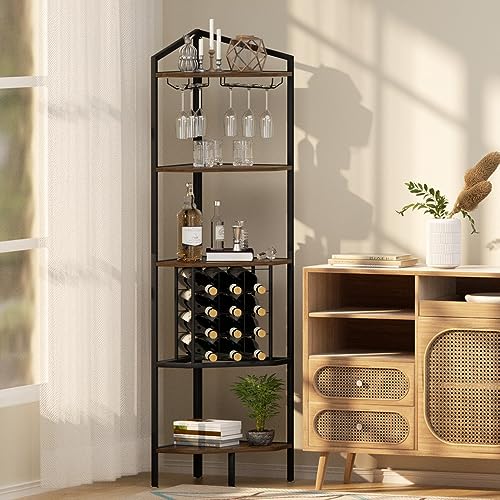 - 【LARGE STORAGE CAPACITY】: Wine bar cabinet can hold up to 12 bottles horizontally. 5 Tier corner shelf stand can store extra plants, books, decorative objects and more. It also comes with 2 wine glass holders for 6 glasses, so you can enjoy life at any time.