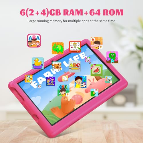 - 【High Performance Kids Tablet】10-inch tablet for kids equipped with 1280x800 IPS HD touch screen, lastest Android 13 operating system, Quad-core processor, 6(2+4)GB + 64GB, Wifi, Bluetooth and dual camera.