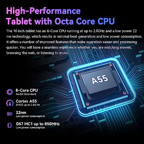 • 👍Ultra High Performance Octa-Core CPU, large-capacity battery: The 10-inch tablet is equipped with a powerful A55 architecture and an 8-core CPU, providing smooth and fast performance. It uses a low-power 22nm process to ensure the lowest power consumption and heat generation. Equipped with a 5000mAh high-capacity battery, it can easily support you to enjoy reading and browsing for a longer period of time. NOTE: Battery life depends on device settings and application usage.