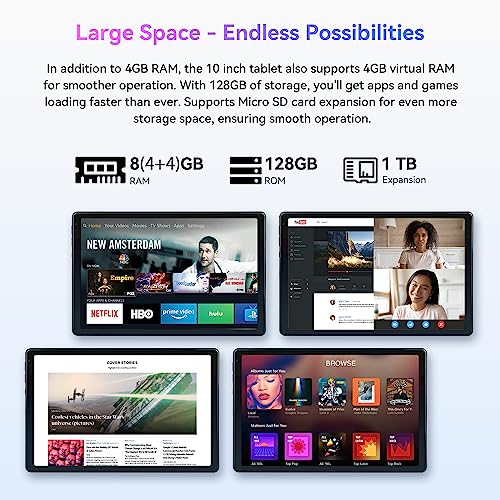 - 💎8GB RAM+ 128GB ROM+ 1TB Expandable: The tablet 10 inch is equipped with 8GB(4GB +4GB expansion)RAM, 128GB internal storage, and supports expansion to 1TB via TF card (TF card not included). These configurations allow the Android tablet to have a fast response speed, allowing you to have a good gaming experience. Simultaneously playlists, online classes, virtual learning, video conferencing and office work this tablet is a perfect companion.