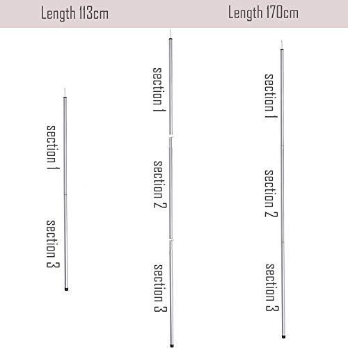 - Adjustable Tent Poles: The poles 2 pcs in a set, Each pole can be broken down to 3 section of 57cm each. You can freely assemble different heights according to your needs 113cm and 170cm.