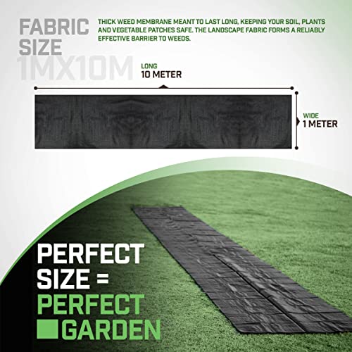 • 105 GSM - 1m wide and 10m long, 105 gsm thick weed control membrane meant to last long, keeping your soil, plants and vegetable patches safe. The landscape fabric forms a reliably effective barrier to those pesky weeds