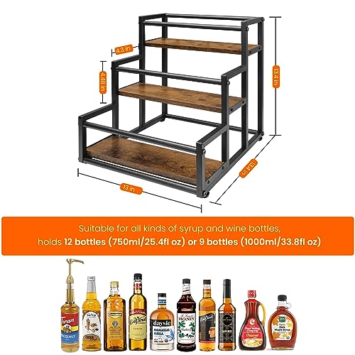 - CONVENIENT DESIGN: The size of this syrup rack: 13" W x 13.4" H x 13.4" D, the stepped design allows your syrup bottles, flavored vinegar bottles, salad dressing bottles to be clearly classified and fully displayed, It can hold up to 12 bottles (25.4 oz/750ml), with 4 standard syrup bottles fitting on each tier for easy accessibility and visibility.