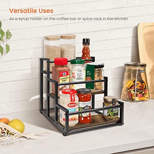 - STYLISH & ELEGANT: Rustic brown wood surface for an old-time classic look, rigid black iron for industrial chic style, they now come together on coffee syrup stand to bring a elegant style to your home and go along with your theme in coffee station.