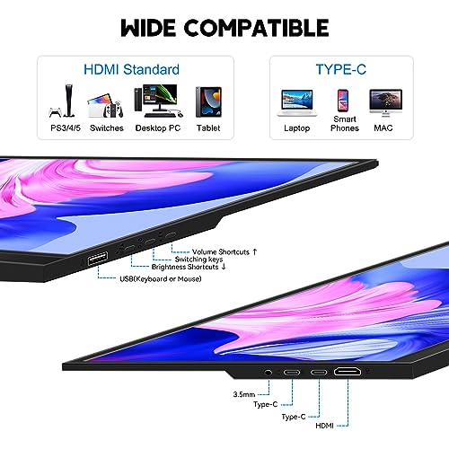- Wide Application -This 14 inch usb c monitor equipped with 2 USB Type-C ports and HDMI port, USB Port could connect the mouse keyboard easy access to your favorite devices with 1 cable solution, compatible with most laptop, smartphone, PC, PS4, XBOX ONE, or Nintendo Switch and more.