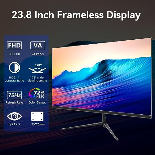 - 【FHD Farmeless Monitor 】-24 Inch monitor with 1920 x 1080 at 75Hz . The 1ultra-wide 178° design immerses you completely into the working landscape, screen as the images appear to wrap around you for an in depth, immersive experience.