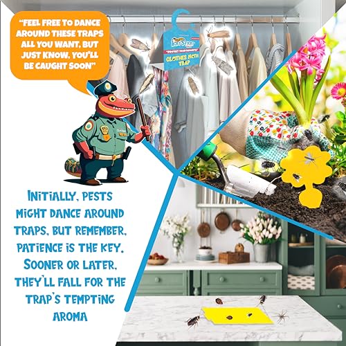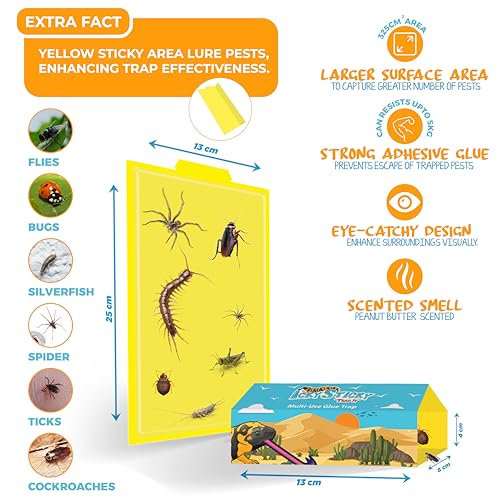 - 4 MULTI-USE PEST TRAPS: Peanut-Butter Scented, Large Surface Area, Safe, and Super Effective Sticky Pads for Invertebrate Pests like Spiders, Silverfish, Mosquito, Cockroaches, Flies, Bugs, Ticks, and other pests. | Story-Inspired Eye-Catchy Design with Yellow Sticky Side which gets Extra Attention from Pests |
