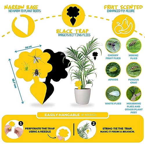 - 12 FRUIT FLY AND FUNGUS GNAT STICKY TRAPS: | 6 Yellow 6 Black | Scented, Decorative, Hanging, Double-sided Sticky Fruit Fly Catcher Stickers | Fly Killer for Indoor Plants, Outdoor, Garden, Balcony, Home and Kitchen.