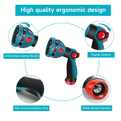 • 10 FUNCTIONS SPRAY NOZZLE - IDEALHOUSE garden hose nozzle with 10 function for more choices. This heavy duty nozzle has an easy-to-use thumb control design. No need to squeeze, easy to control the flow. The soft rubber coating handle makes this sprayer very comfortable to hold and it also prevents slipping.