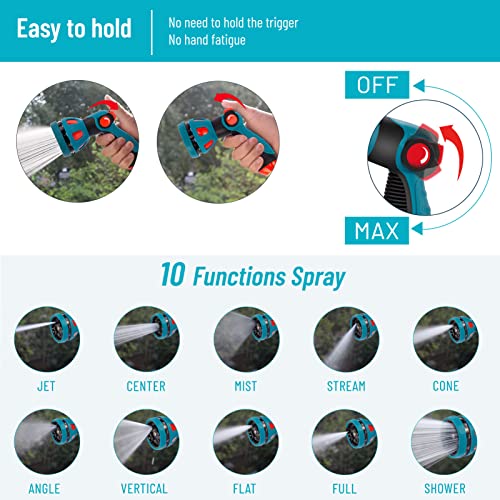 • 10 FUNCTIONS SPRAY NOZZLE – IDEALHOUSE garden hose nozzle with 10 function for more choices. This heavy duty nozzle has an easy-to-use thumb control design. No need to squeeze, easy to control the flow. The soft rubber coating handle makes this sprayer very comfortable to hold and it also prevents slipping.