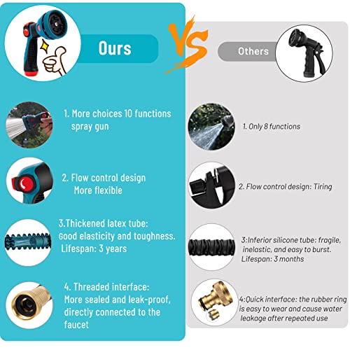 • 3750D FABRIC AND DOUBLE-LAYER LATEX HOSE - Expanding water hose uses a high-density double-layer latex core and a powerful 3750D polyester fabric cover, to prevent breakage and leakage, which is more densely braided and more wear-resistant than other hoses on the market, and has undergone a unique anti-oxidation treatment for a longer service life! Never worry about untangling your hose ever again.