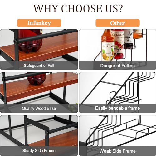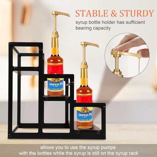 • Sturdy and Durable: Crafted with a sturdy wooden base and a sleek black metal frame, this syrup rack is built to last. It ensures stability and durability, even when using syrup pumps while the bottles are still in place.