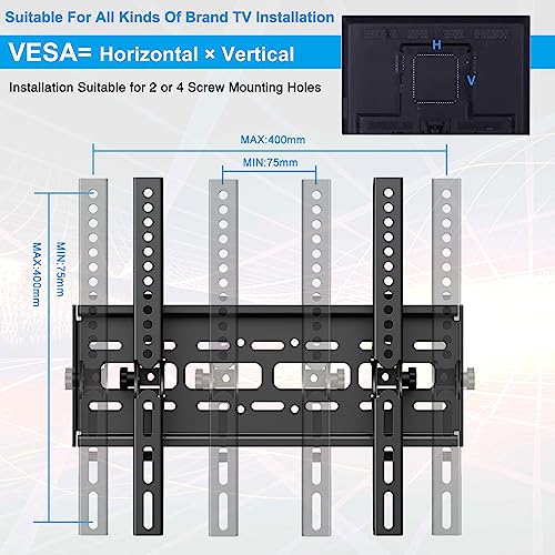- 【Universal Design】Small Tilting TV wall mount for 26" - 60" flat-panel or curved TVs up to 100lbs/50kg, VESA(mounting hole pattern). Our TV tilt mount has a compatible faceplate that fits VESA 75X75mm, 100X75mm, 100X100mm, 100X200mm, 200X100mm, 200X200mm, 200X300mm, 300X100mm, 300X200mm, 300X300mm, 400X200mm, 400X300mm, 400X400mm. Please check VESA (TV mounting hole pattern), TV weight, wall stud location and possible blocked cable/input.