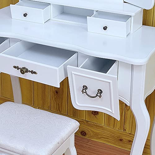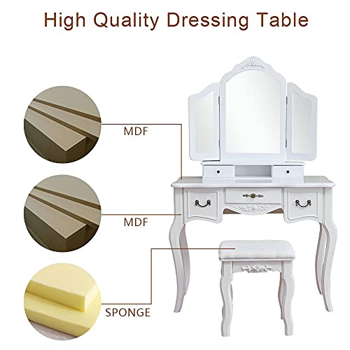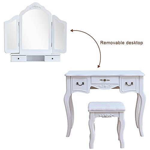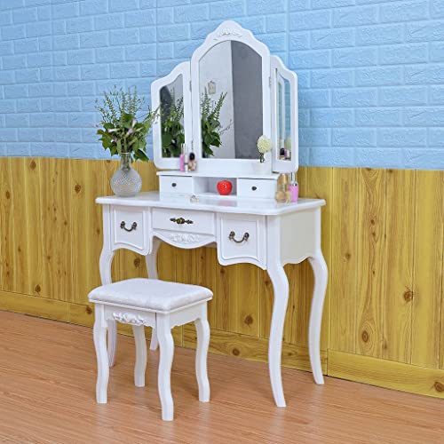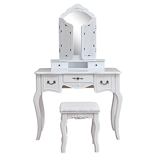 - This dresser consists of a tri-fold , two storage compartments, three drawers, simple Queen Anne legs and a dressing stool.